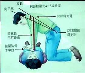 3、按壓姿勢(shì)為肩肘腕成一直線身體微向前傾利用上半身力量垂直向下按壓,頻率為每分鐘至少100次。